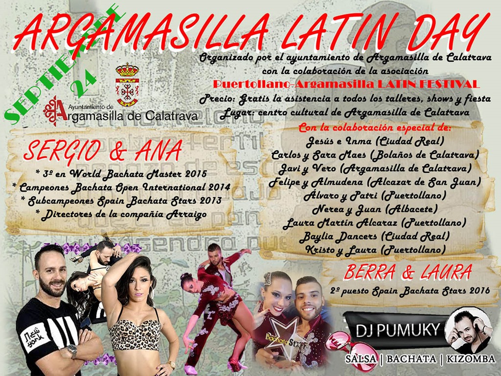 Cartel promocional del Argamasilla Latin DayArgamasilla de Calatrava · Argamasilla de Calatrava vivirá este fin de semana un maratoniano ‘Latin Day’. Dará comienzo el sábado 24 de septiembre a las 11,00 de la mañana y se prolongará hasta las 6 de la madrugada del día siguiente. El denominado ‘Argamasilla Latin Day’ ofrecerá salsa, bachata, kizomba, bailes latinos y otros espectáculos programados, que podrán disfrutarse de la mano de los mejores bailarines.  Se trata de una actividad organizada por el Ayuntamiento de Argamasilla de Calatrava, con la colaboración de la Asociación Puertollano-Argamasilla Latin Festival. A lo largo de las 14 horas previstas, el Centro Cultural rabanero se tornará en templo para este evento, dando también cabida a talleres, shows y fiesta; en definitiva, diversión asegurada para todos los asistentes.