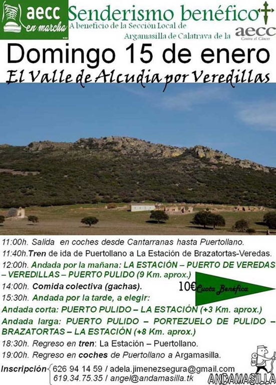 Cartel de la ruta de senderismo del domingo 15 de enerooretania.es – Argamasilla de Calatrava – (Ciudad Real) · Andamasilla organiza una ruta de senderismo a beneficio de la «Asociación Española Contra el Cáncer» el próximo domingo 15 de enero, con viaje en tren desde Puertollano hasta La Estación de Brazatortas-Veredas, y desde allí andando en ruta circular visitando la antigua aldea de Veredillas en el Valle de Alcudia.