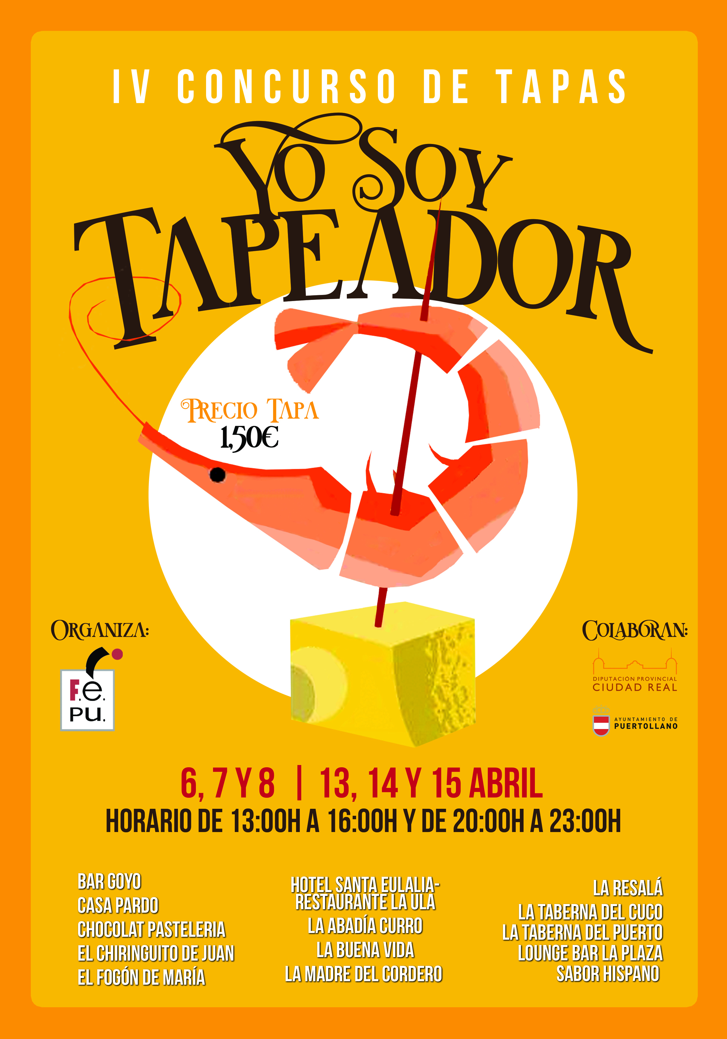 Promocionar los establecimientos hosteleros de Puertollano y saborear las mejores y más originales tapas de los bares de la ciudad, al tiempo que se contribuye a dinamizar la economía local, son los objetivos que por cuarto año consecutivo persigue la Federación de Empresarios de la comarca de Puertollano, que en colaboración con el Ayuntamiento de Puertollano organiza el concurso de tapas “Yo soy tapeador”, en el que varios establecimientos combinarán la alta cocina con la cocina tradicional. El cuarto concurso de tapas “Yo soy tapeador”, con el que también se pretende potenciar la actividad turística y comercial de la ciudad, se desarrollará durante dos fines de semana, los días 6, 7 y 8 y 13, 14 y 15 de abril.