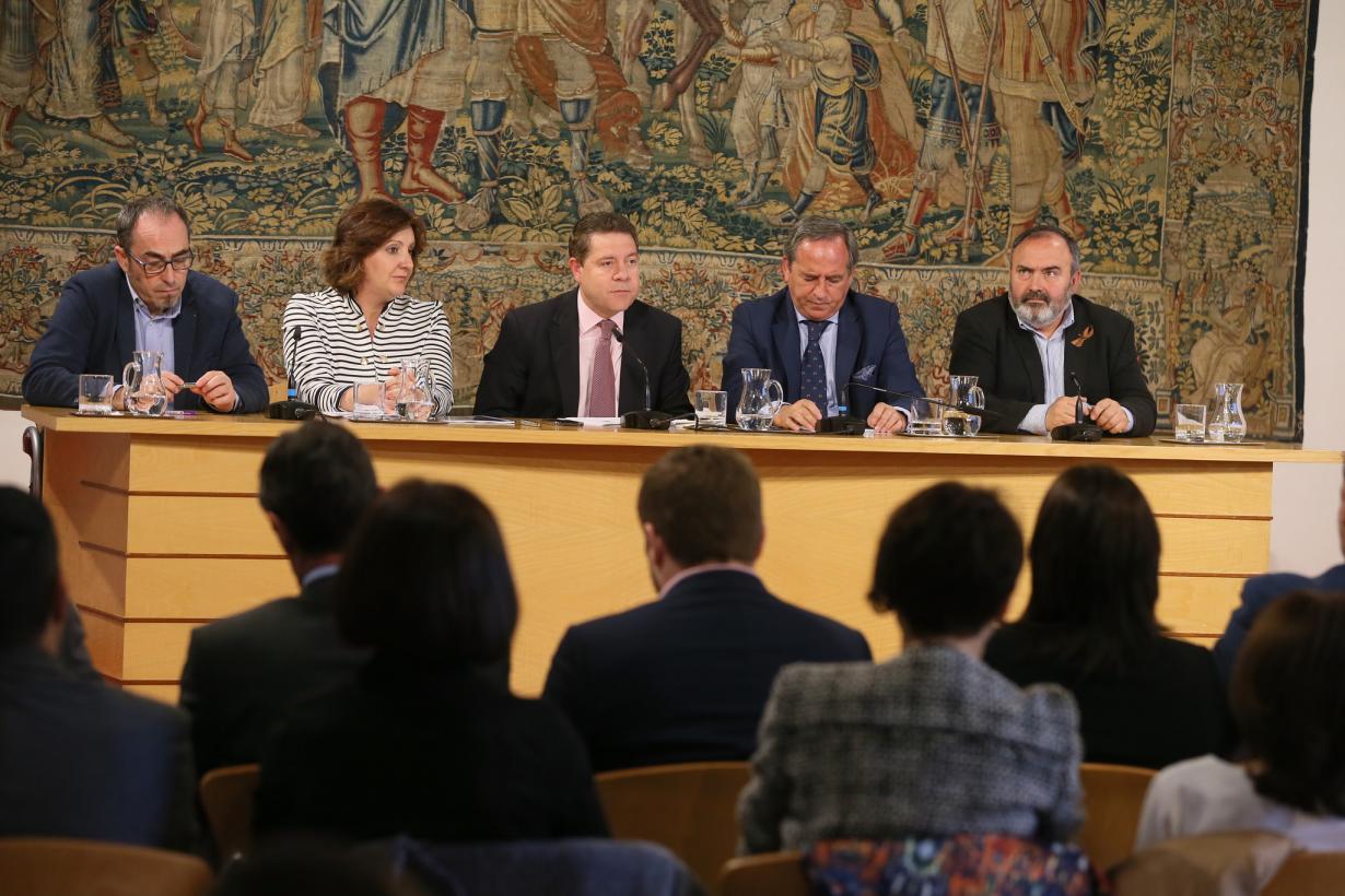 El presidente de Castilla-La Mancha, Emiliano García-Page, ha rubricado esta mañana, en el Palacio de Fuensalida, sede de la Presidencia autonómica en Toledo, el Plan Regional de Empleo y Garantía de Rentas con los representantes de CCOO, UGT y CECAM. Este nuevo Plan, que tiene una vigencia de tres años, está dotado con 335 millones de euros y beneficiará a 60.000 personas.