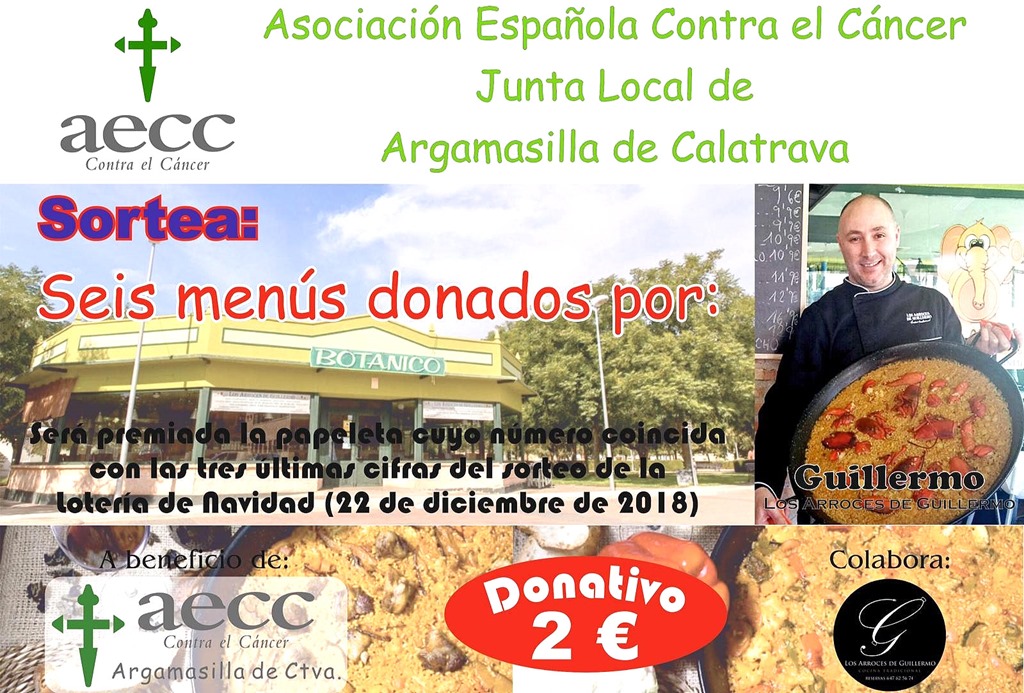 La papeleta cuyo número coincida con las tres últimas cifras del sorteo de la Lotería de Navidad del 22 de diciembre, será premiada con seis estupendos menús, donados por los `Arroces de Guillermo´, quien ha tenido a bien contribuir con esta buena causa, aportando sabor a las fechas navideñas con los platos especialidad de la casa.