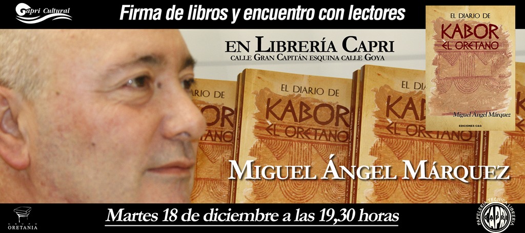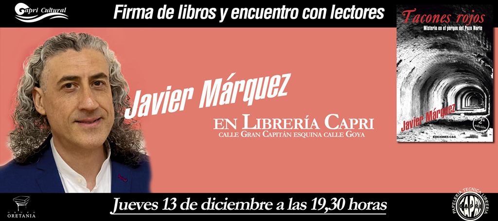 Estas actividades culturales están incluidas dentro de la programación que para el mes de diciembre tiene prevista la librería puertollanera y que tendrán lugar desde el día 13 de diciembre, hasta el día 21 de ese mismo mes, precisamente el jueves, día 13, a las 19,30 horas, y como pistoletazo de salida, ha sido el día elegido por Javier Márquez para reunirse con sus lectores y firmar ejemplares de su libro, a la misma hora, pero del martes, día 18, hará lo propio Miguel Ángel Márquez. Estos dos encuentros tendrán lugar en la Librería Caprí, situada en la esquina de la calle Goya con la calle Gran Capitán de Puertollano.