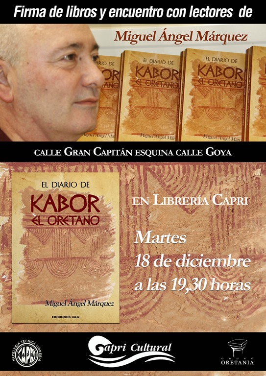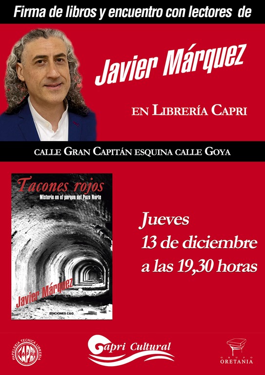 Oretania · Dentro de las actividades programadas por Capri Cultural, para el mes de diciembre, tendrá lugar los días 13 y 18 de dicho mes, ambas a las 19,30 horas, los encuentros con lectores y firmas de libros de los escritores Javier Márquez y Miguel Ángel Márquez, autores de ‘Tacones rojos. Misterio en el Parque del Pozo Norte’ y ‘El diario de Kabor el oretano’, respectivamente, en la librería Capri, situada en la esquina de calle Goya con calle Gran Capitán de Puertollano.