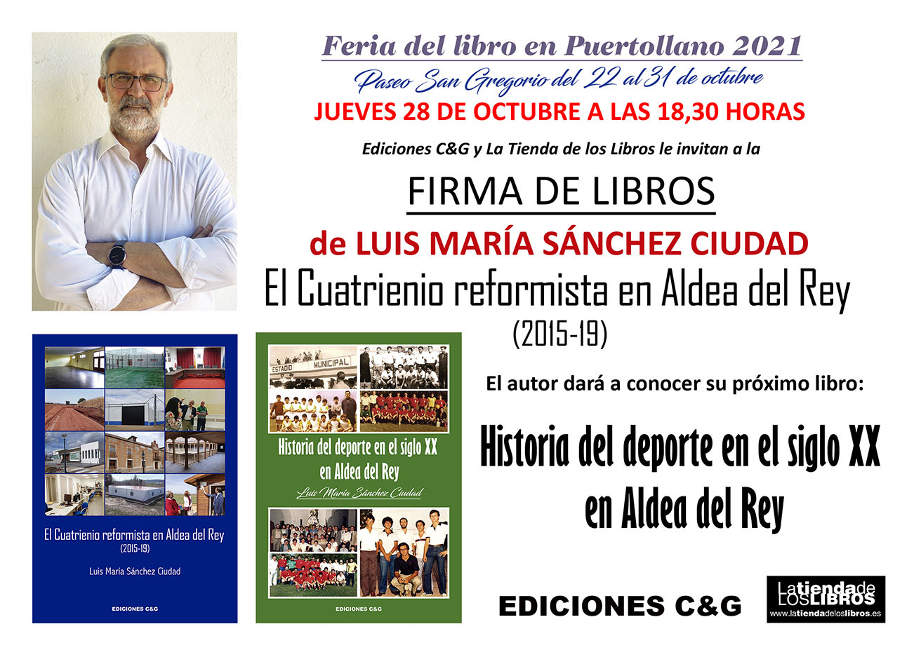 Mañana jueves, día 28 de octubre, Luis María Sánchez Ciudad, estará en la caseta de ‘La Tienda de los Libros / Ediciones C&G’ a partir de las 18,30 horas, donde firmará ejemplares de su libro ‘El Cuatrienio reformista en Aldea del Rey (2015-19). Y dará a conocer su próximo libro ‘Historia del deporte en el siglo XX en Aldea del Rey’, con el que pretende dar a conocer la importancia que el deporte ha tenido en tantas generaciones de aldeanos y que será presentado en Aldea del Rey a finales de otoño.