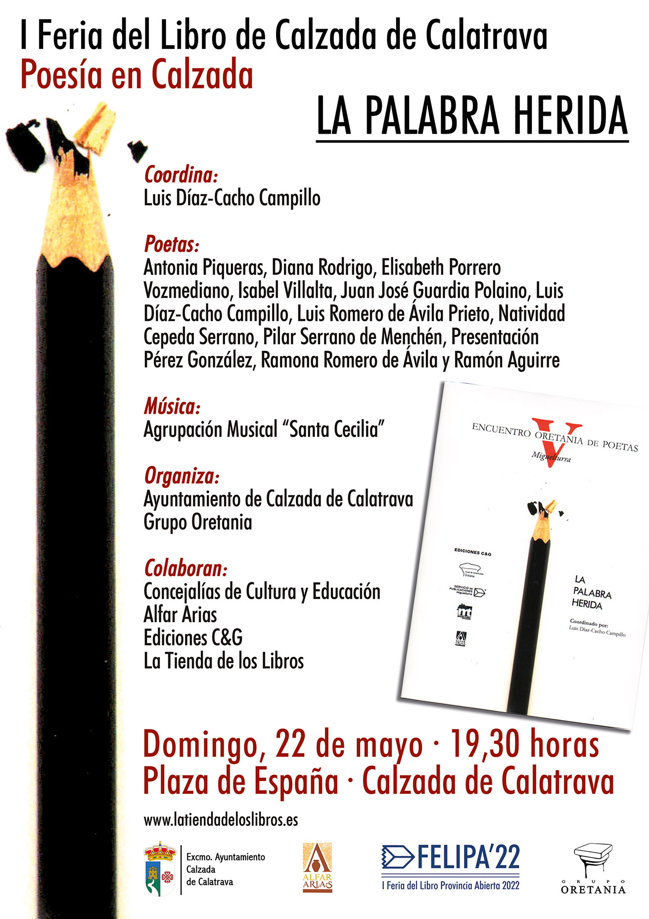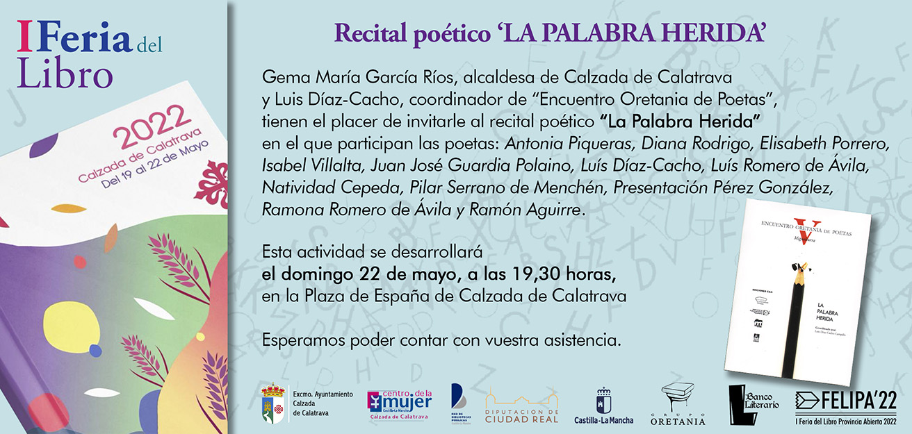 Antonia Piqueras, Diana Rodrigo, Elisabeth Porrero, Isabel Villalta, Juan José Guardia Polaino, Luís Díaz-Cacho, Luís Romero de Ávila, Natividad Cepeda, Pilar Serrano de Menchén, Presentación Pérez González, Ramona Romero de Ávila y Ramón Aguirre, declamarán en la calzadeña Plaza de España, a las 19,30 horas, del domingo día 22 de mayo, con el acompañamiento de la Agrupación Musical ‘Santa Cecilia’.