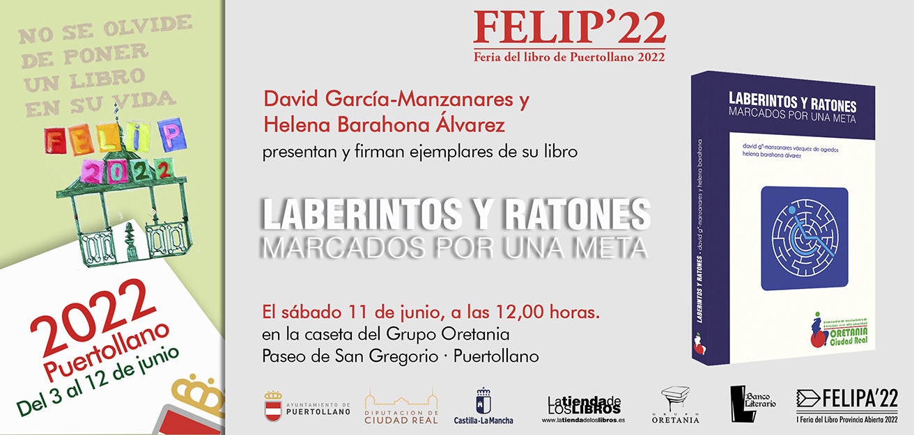 Oretania, en la Feria del Libro de Puertollano, situada en el Paseo de San Gregorio, David García-Manzanares y Helena Barahona, firmarán “Laberintos y Ratones Marcados por una Meta”. El libro está editado por Oretania CR, la Federación Provincial de Asociaciones de Personas con Discapacidad Física y Orgánica y la recaudación de la venta de dicho libro irá destinado íntegramente a esta Federación de Asociaciones de Personas con discapacidad.