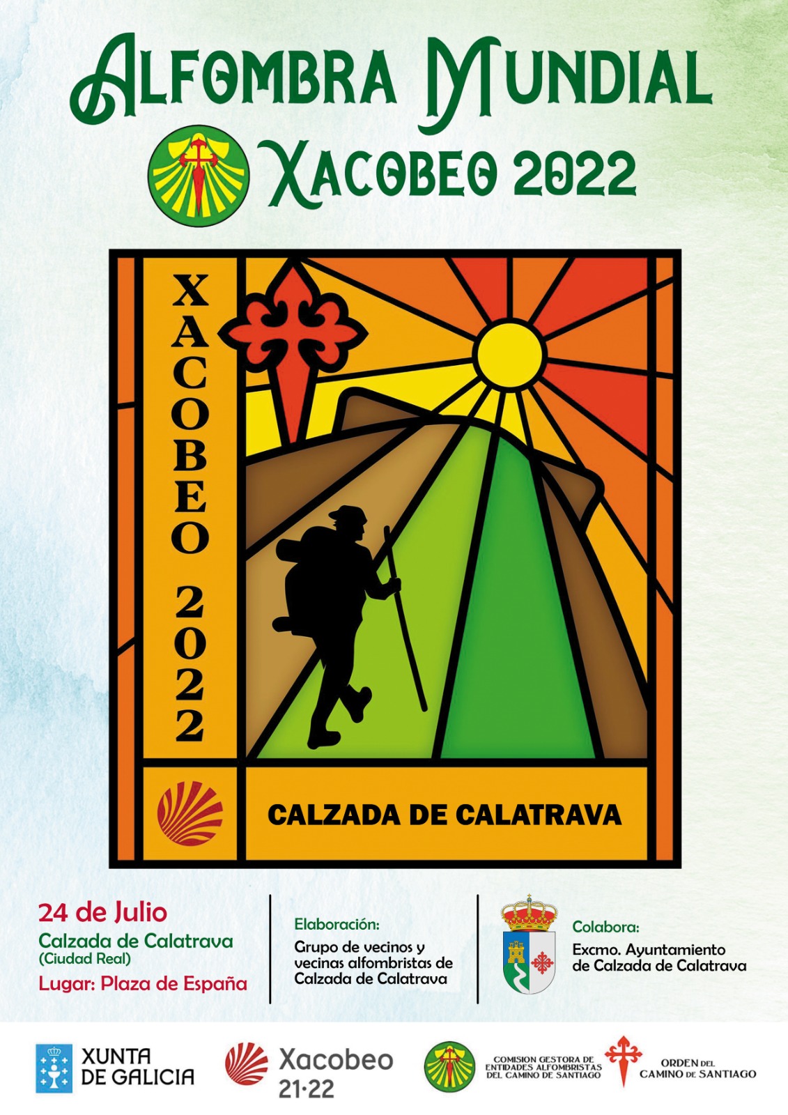 Los alfombristas de Calzada de Calatrava, capitaneados por Francisco Acevedo Ciudad, el domingo 24 de julio, a partir de las dos de la madrugada, harán la ‘Alfombra Mundial del Xacobeo 2022’, en la Plaza de España con la colaboración del Ayuntamiento calzadeño, quien financia los materiales necesarios (sal y pintura).