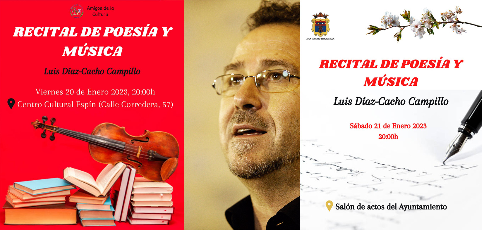 En este mes de enero del recién estrenado 2023, está previsto que, Luis Díaz-Cacho, visite las poblaciones de Lorca y Moratalla, el primero de ellos tendrá lugar en el Salón de Actos del Centro Cultural Espín de Lorca, situado en la Calle Corredera, el 20 de enero a las 20:00 horas. El evento que está organizado por la ‘Asociación de Amigos de la Cultura de Lorca’, contará con un recital de poesía y música. El siguiente de los recitales tendrá lugar el sábado 21 de enero, a las 20:00 horas, en el Salón de Actos del Ayuntamiento de Moratalla.