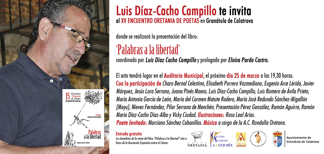 Nota: El tema de este “XV Encuentro Oretania de Poetas” de la provincia de Ciudad Real, es “Palabras a la libertad”. Se celebrará el 25 de marzo en Granátula de Calatrava. Está coordinado por el poeta solanero Luis Díaz-Cacho. Esta edición cuenta con el prólogo de la poeta, Eloísa Pardo Castro y las composiciones poéticas de Charo Bernal Celestino, Elisabeth Porrero Vozmediano, Eugenio Arce Lérida, Javier Márquez, Jesús Lara Serrano, Juana Pinés Maeso, Luis Díaz-Cacho Campillo, Luis Romero de Ávila Prieto, María Antonia García de León, María del Carmen Matute Rodero, María José Redondo Sánchez-Migallón (Mayu), Nieves Fernández, Pilar Serrano de Menchén, Presentación Pérez González, Ramón Aguirre, Ramón María Díaz-Cacho y Vicky Ciudad. Las ilustraciones de Rosa Leal Arias y la colaboración de los “poetas del barro”, Ángel Leal, Graci Arias y María de Gracia Leal.