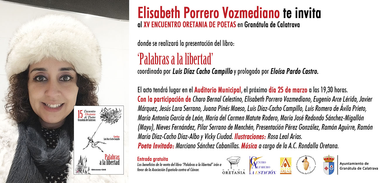 Nota: El tema de este “XV Encuentro Oretania de Poetas” de la provincia de Ciudad Real, es “Palabras a la libertad”. Se celebrará el 25 de marzo en Granátula de Calatrava. Está coordinado por el poeta solanero Luis Díaz-Cacho. Esta edición cuenta con el prólogo de la poeta, Eloísa Pardo Castro y las composiciones poéticas de Charo Bernal Celestino, Elisabeth Porrero Vozmediano, Eugenio Arce Lérida, Javier Márquez, Jesús Lara Serrano, Juana Pinés Maeso, Luis Díaz-Cacho Campillo, Luis Romero de Ávila Prieto, María Antonia García de León, María del Carmen Matute Rodero, María José Redondo Sánchez-Migallón (Mayu), Nieves Fernández, Pilar Serrano de Menchén, Presentación Pérez González, Ramón Aguirre, Ramón María Díaz-Cacho y Vicky Ciudad. Las ilustraciones de Rosa Leal Arias y la colaboración de los “poetas del barro”, Ángel Leal, Graci Arias y María de Gracia Leal y, además, tendremos en Granátula de Calatrava, como poeta invitado, a Marciano Sánchez Cabanillas. El acompañamiento musical vendrá de la mano de la A. C. “La Rondalla Oretana”.