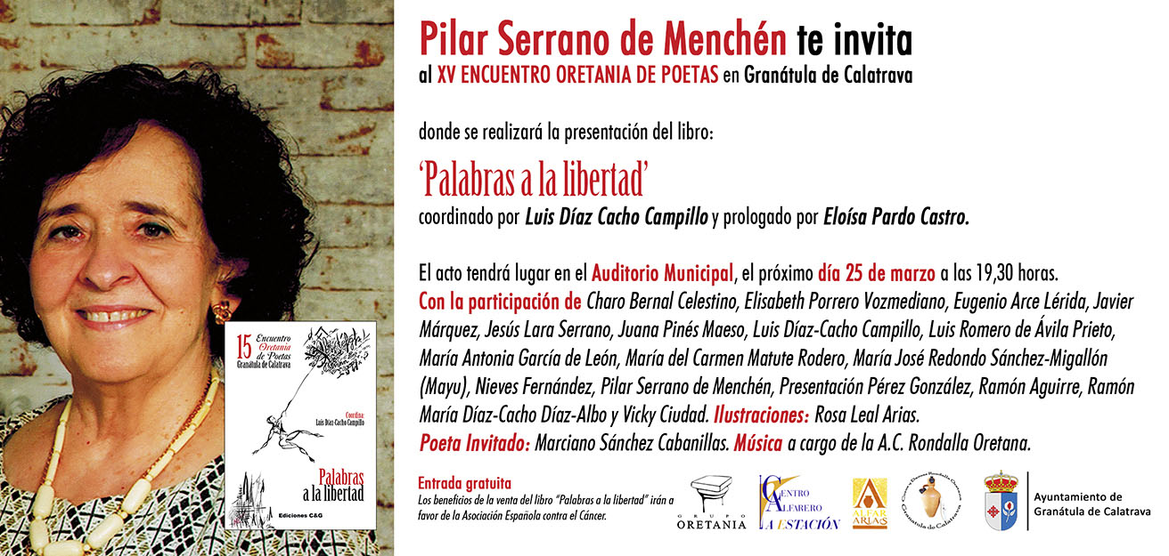 El lema del “XV Encuentro Oretania de Poetas” de la provincia de Ciudad Real, es “Palabras a la libertad”. Se celebrará el 25 de marzo, a las 19,30 horas, en el Auditorio de Granátula de Calatrava, y está coordinado por el poeta solanero Luis Díaz-Cacho.