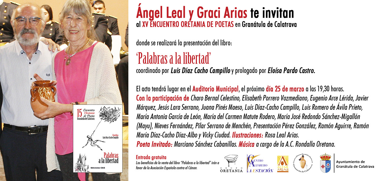 El lema del “XV Encuentro Oretania de Poetas” de la provincia de Ciudad Real, es “Palabras a la libertad”. Se celebrará el 25 de marzo, a las 19,30 horas, en el Auditorio de Granátula de Calatrava, y está coordinado por el poeta solanero Luis Díaz-Cacho.