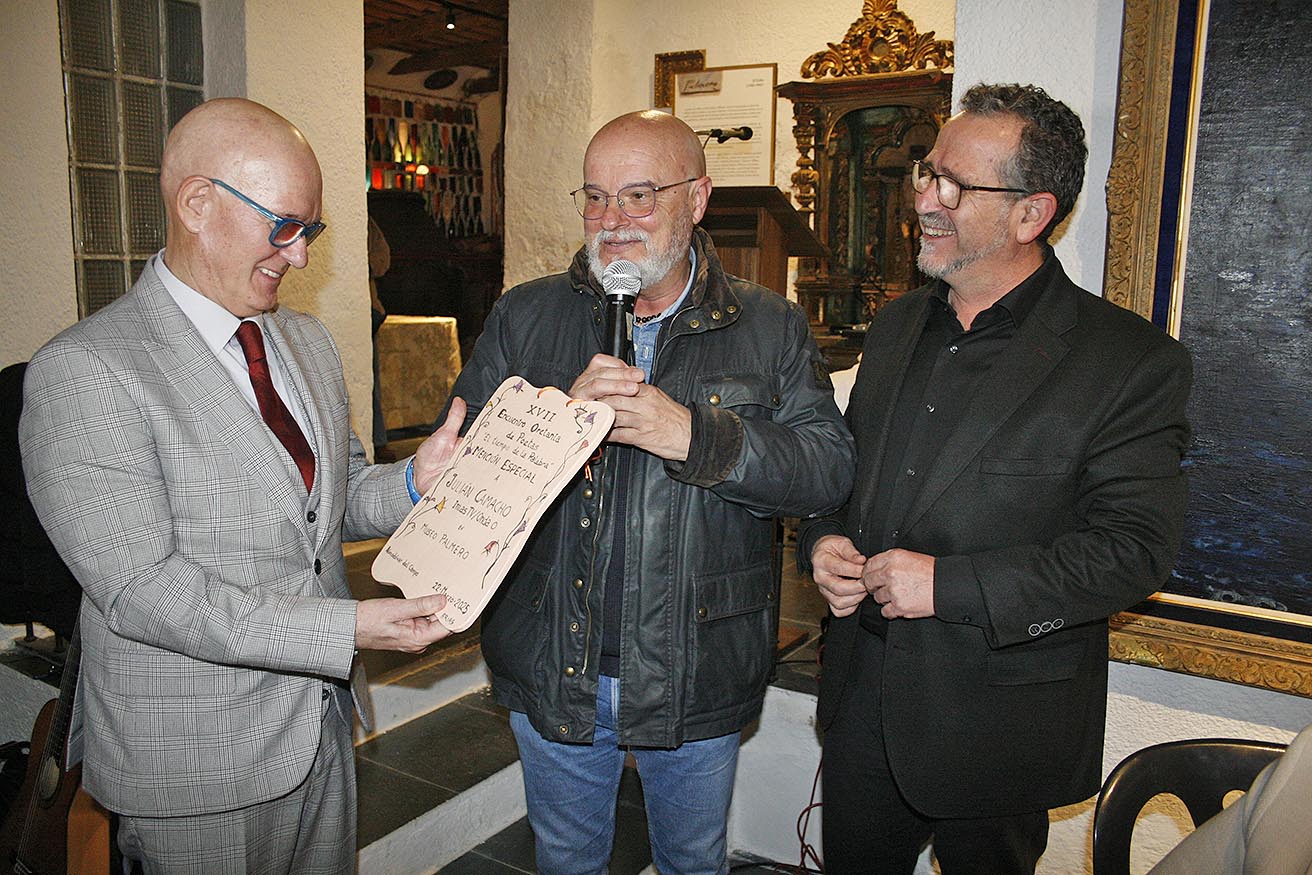 Pepe J. Galanes, fotógrafo y receptor del reconocimiento en la edición anterior, fue el encargado de entregarle una placa que, nuevamente es obra de Graci Arias y Ángel Leal, mentores de Alfar Arias y el Centro Alfarero la Estación, y con la que se venía a valorar el compromiso con la cultura, la poesía y la palabra, así como la sensibilidad y profesionalidad en la difusión del talento creativo de la provincia a través de los medios que Julián dirige.