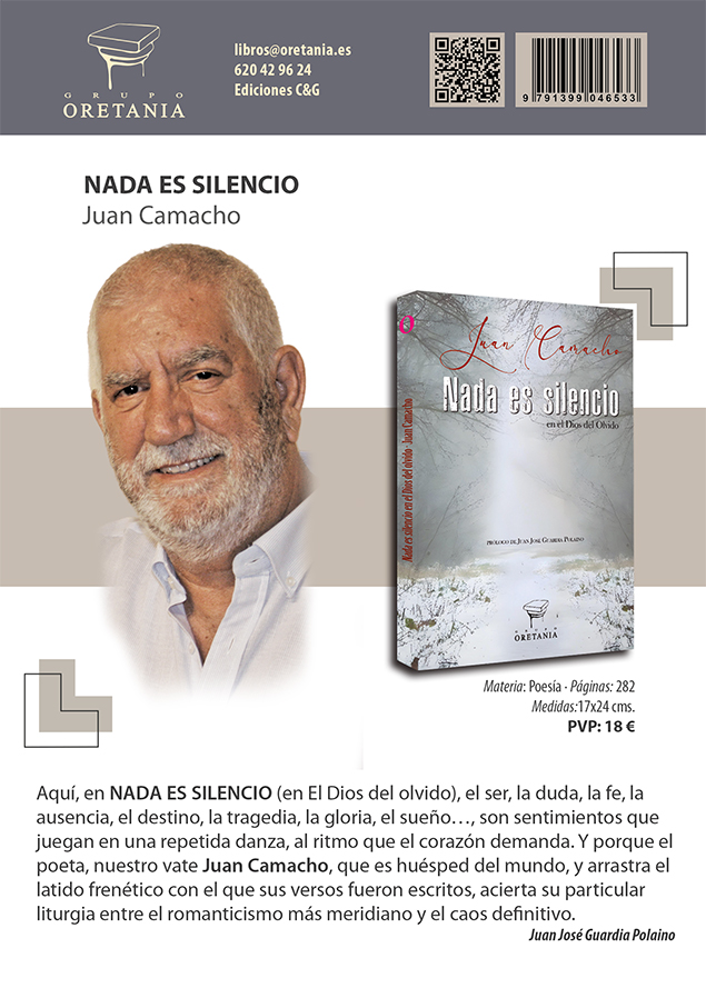 “Nada es silencio, en el Dios del olvido”, editada por el Grupo Oretania, no es solo un nuevo libro, otro más, de Juan Camacho, sino que, en él, su autor vuelca la mirada sobre sí mismo y a la vez sobre toda su obra anterior, lo cual es tanto como decir que sobre toda su vida poética que se funde y recoge en una sola cosa: su poesía.