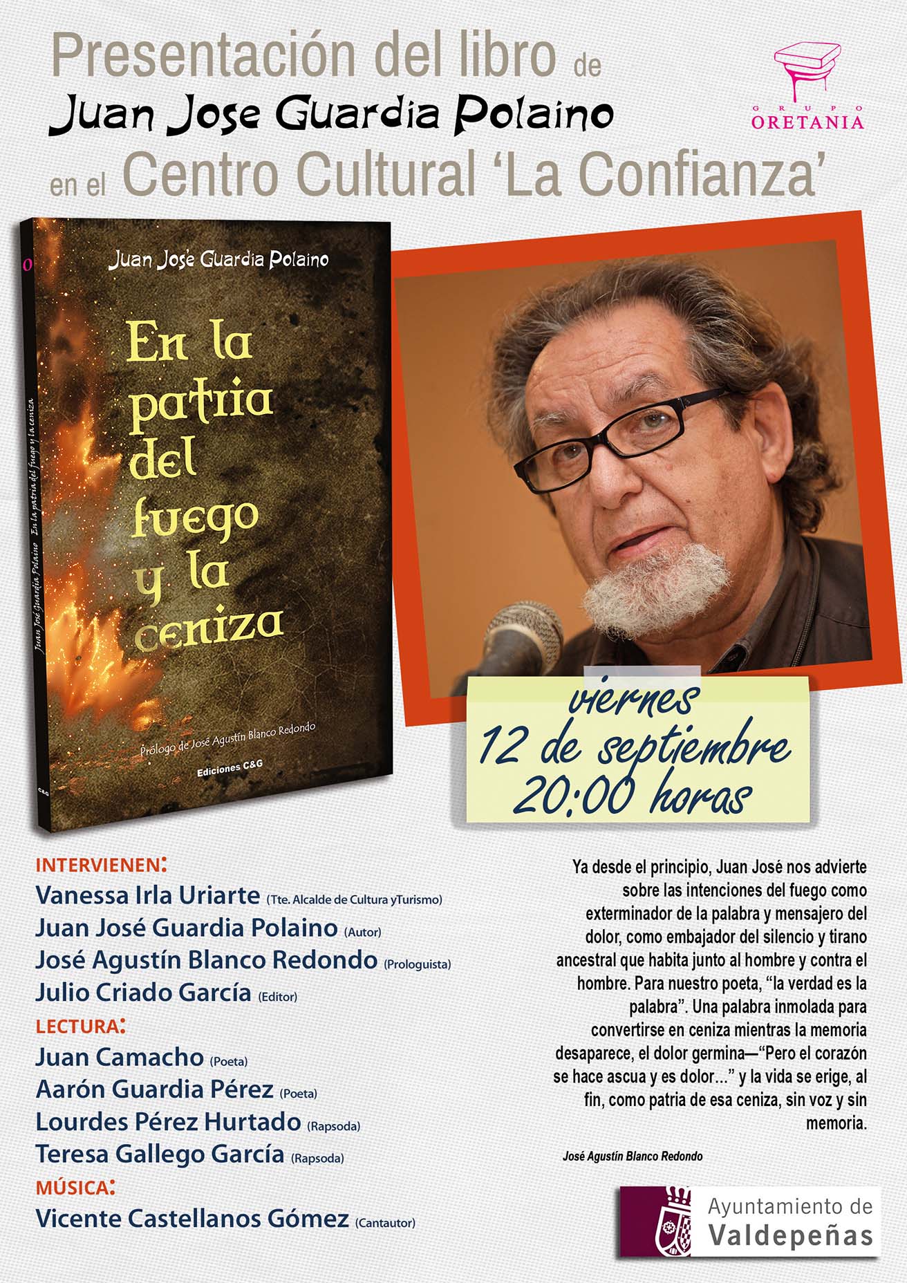 El gran Centro Cultural “La Confianza” de Valdepeñas, es el escenario elegido para la presentación del nuevo poemario de Juan José Guardia Polaino, ‘En la patria del fuego y la ceniza’, editado por Ediciones C&G (Grupo Oretania). El acto tendrá lugar el viernes 12 de septiembre, a las 20:00 horas y se contará, además de la presencia del autor Juan José Guardia Polaino, con la participación de la primer teniente de alcalde y concejala de Cultura y Turismo de Valdepeñas, Vanessa Irla Uriarte; con el prologuista de la obra, José Agustín Blanco Redondo y con el editor Julio Criado García. Además, leerán poemas Aarón Guardia Pérez, Lourdes Pérez Hurtado, Teresa Gallego García y Juan Camacho. La música viene de la mano del conocido cantautor Vicente Castellanos Gómez.