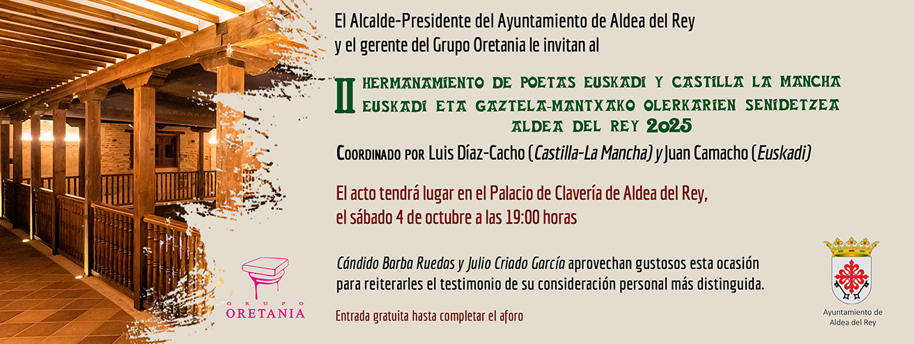 Organizado por el Ayuntamiento de Aldea del Rey en colaboración con el Grupo Oretania. La segunda edición del Hermanamiento Oretania de poetas de Euskadi y Castilla-La Mancha, se celebrará el sábado, 4 de octubre —primer fin de semana de octubre— a las 19:00 horas, en el Palacio de Clavería aldeano..