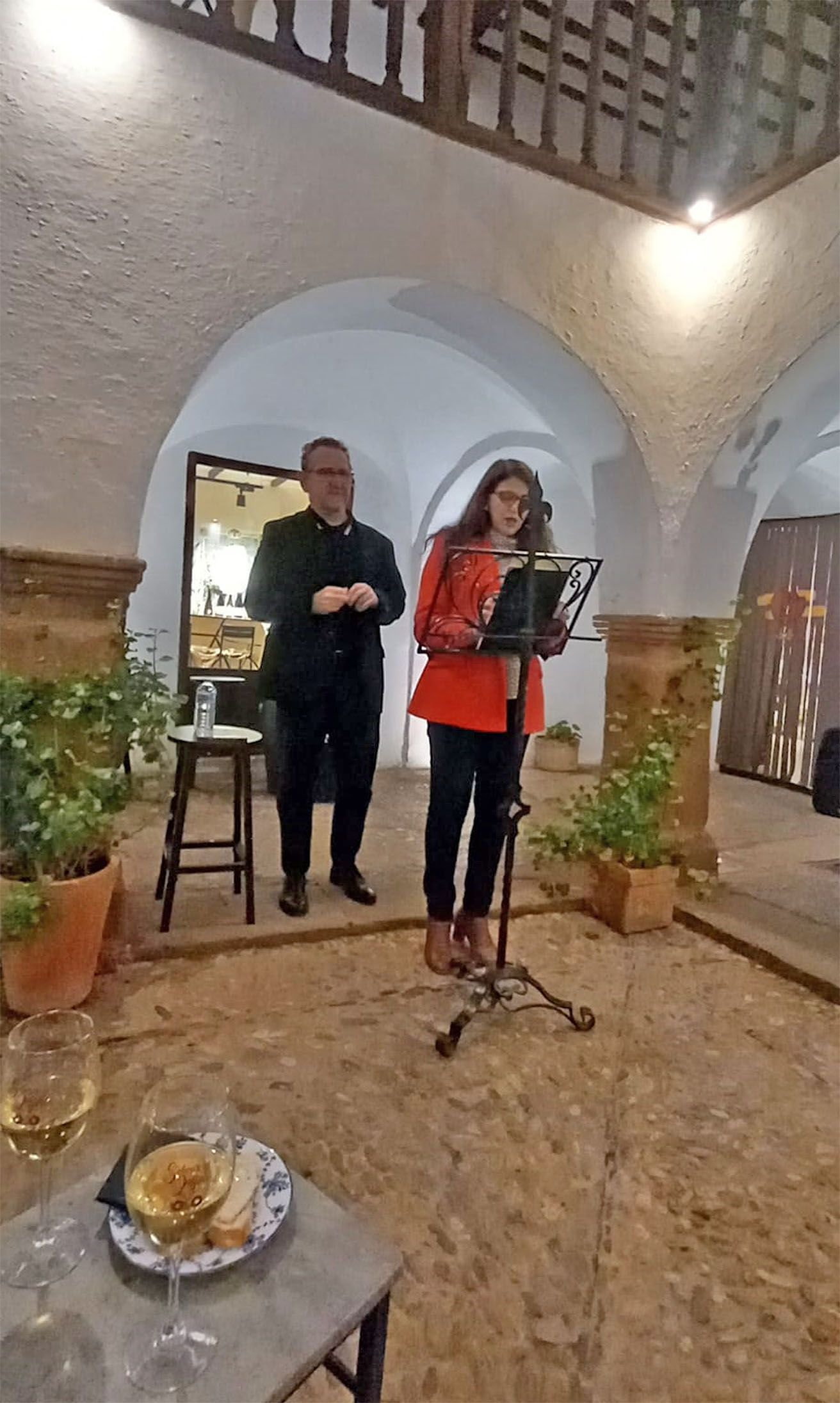 Un encuentro para disfrutar con los sentidos, donde las palabras se entrelazaron con los acordes y el vino acompañó al alma y que Díaz-Cacho descorchó con un poema sobre el simbolismo del vino para compartir la paz, “Abro la cuba con esmero / y escancio el vino / que este vino primero del viñedo / se sembró con el amor de muchas manos / para este instante // Bien merece la paz / este brindis sincero, / que los grandes momentos de la historia / se cerraron con un apretón de manos / y en los labios / el color cencibel del mejor vino / sellando los acuerdos”.