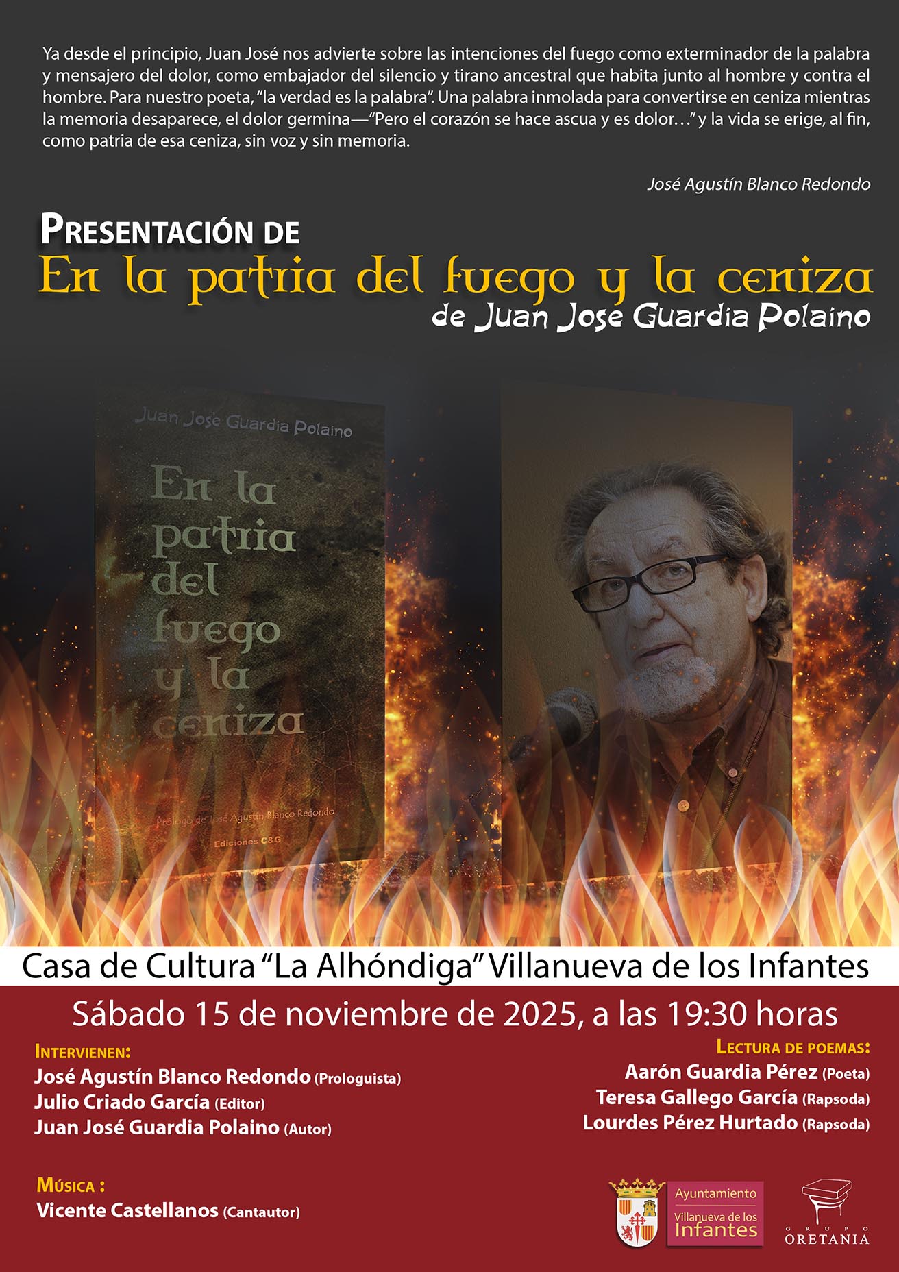 La Casa de Cultura ‘La Alhóndiga’ de Villanueva de los Infantes es el escenario elegido para la presentación del nuevo poemario de Juan José Guardia Polaino, “En la patria del fuego y la ceniza”, editado por Ediciones C&G (Grupo Oretania). El acto tendrá lugar el sábado 15 de noviembre, a las 19:30 horas y se contará, además de la presencia del autor, con la participación del prologuista de la obra, José Agustín Blanco Redondo y con el editor Julio Criado García. Además, leerán poemas Aarón Guardia Pérez, Lourdes Pérez Hurtado y Teresa Gallego García. La música viene de la mano del conocido cantautor Vicente Castellanos Gómez.